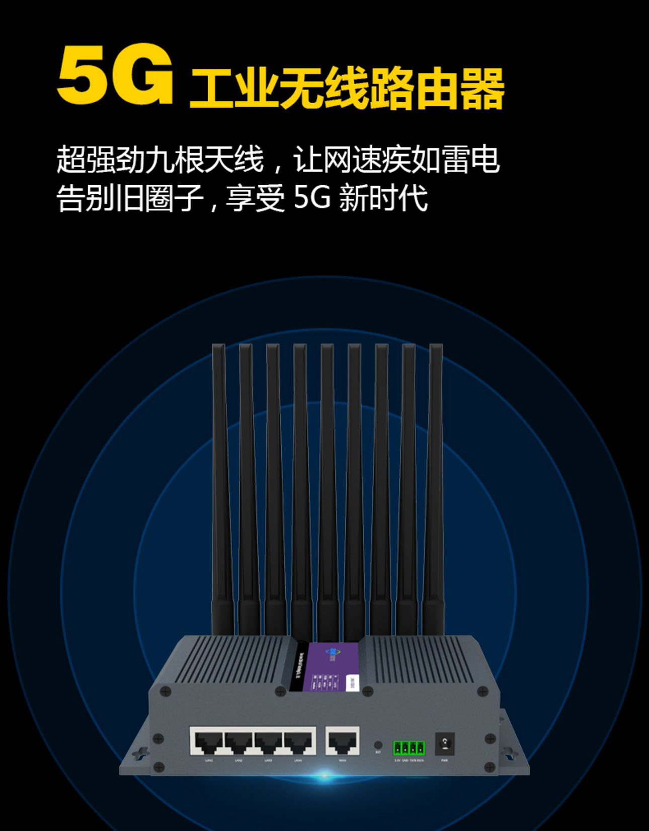 ZR9000 系列工業5G路由器是智聯物聯公司自主研發的 新一代移動路由器,它融合了 5G/4G、2.4G WiFi 和 5.8G WiFi、路由、交換、網管、VPN、防火墻、安全等技術,提供 了靜態路由/動態路由、5G/4G 撥號、QOS、智慧物聯等軟件 特性,是智聯物聯全新打造的高性價比,全功能邊緣網絡終 端設備。