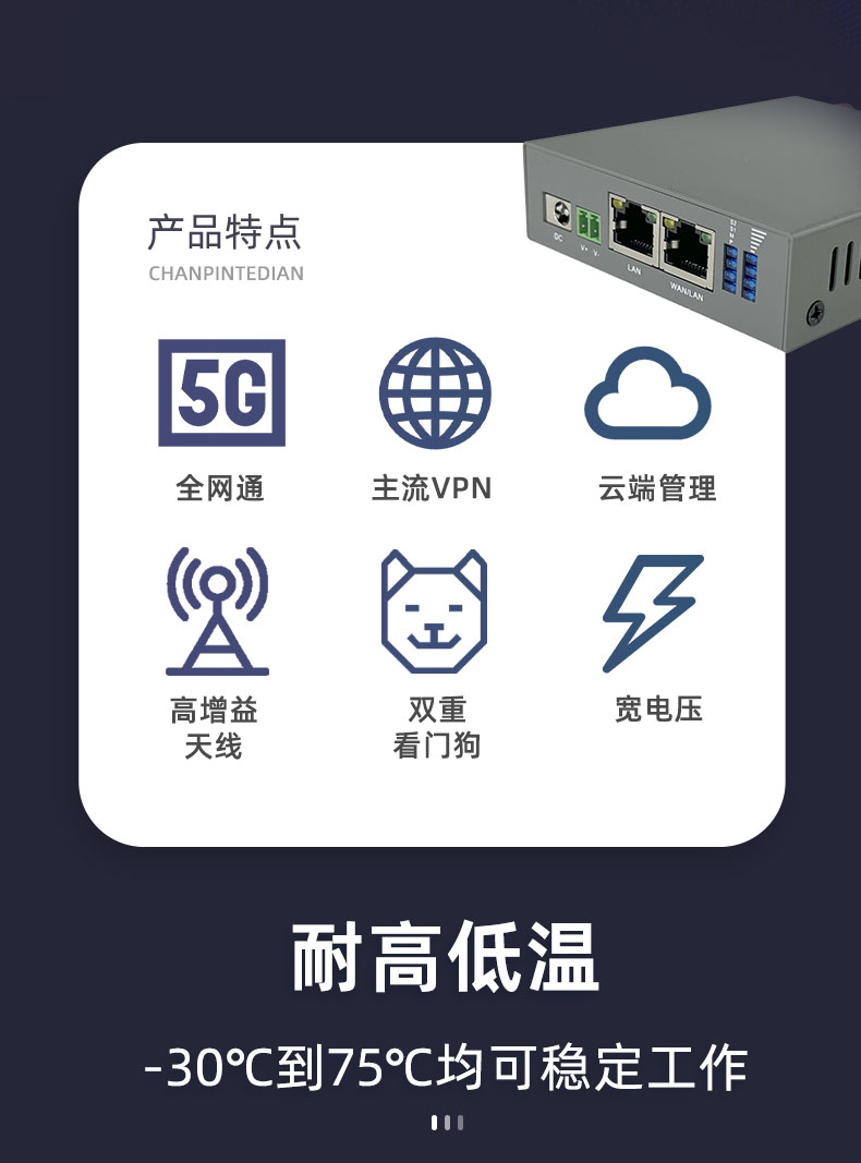 在智慧城市數(shù)字化發(fā)展的今天,智慧路燈宛如時代的引路者,社會建設(shè)也隨著**智慧路燈**的普及、智慧城市的全面建設(shè)而邁入智能化、數(shù)字化、自動化的新世代。可以說智慧路燈的普及是智能化時代開啟的里程碑。 智慧路燈需配備一套具備數(shù)據(jù)采集及傳輸功能的解決方案是實現(xiàn)數(shù)據(jù)可視化、數(shù)字化分析管理的必經(jīng)之路,而**緊湊型DTU** IR2730可作為智慧路燈及其延伸產(chǎn)品(綜合桿、多功能桿等)的通信及數(shù)據(jù)終端,與智慧路燈之間建立數(shù)據(jù)傳輸?shù)膿?jù)點,擁有數(shù)據(jù)采集、協(xié)議轉(zhuǎn)換、網(wǎng)絡(luò)連接、應(yīng)急聯(lián)動、設(shè)備監(jiān)控等功能。并具有數(shù)據(jù)安全、性能穩(wěn)定、高速傳輸及性價比高的特點,在智慧路燈廣泛布局的建設(shè)模式中具有一定的優(yōu)勢。 IR2730工業(yè)路由器(緊湊型5G DTU) 的工業(yè)級設(shè)計 ?工業(yè)級無線模塊與處理器 ?防護等級IP30金屬外殼 ?5V~36V寬電壓適應(yīng)性強 ?-30℃~75℃寬溫支持抗寒耐熱 ?ESD接口防護,防靜電、防浪涌、抗干擾 ?性能穩(wěn)定適用無人值守環(huán)境 ?雙千兆網(wǎng)口、雙卡、雙串口RS232/RS485