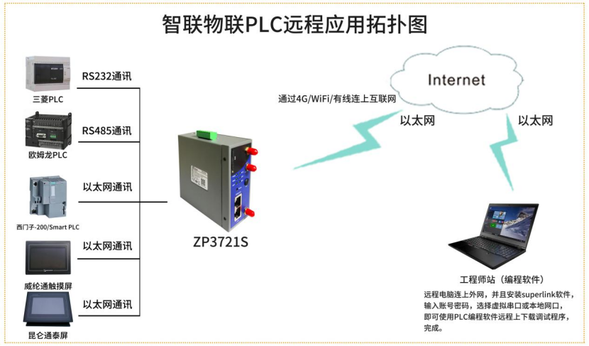 目前西門子SIMATIC S7-1200這款PLC已經被廣泛采用,在使用過程中,無論是為了能更快的給客戶提供技術支持,還是為了減少去現場調試的售后成本費用等等諸多原因。相信很多人都在想,如果可以通過遠程給PLC進行上下載程序的操作,那該多好。 在如今這個物聯網時代,遠程對PLC調試上下載等操作已經開始在各個運營商中得到了應用,為企業解決了人員現場值守或運維差旅的問題,本期以智聯物聯的PLC遠程控制網關ZP3721S為例來講解遠程控制PLC的方法。 第一步,簡單介紹一下這款產品的接口,它具備2個以太網口和1路串口(RS232和RS485二選一),所以這款產品是可以同時支持串口PLC或者網口PLC的。由于S7-1200是網口的,所以串口我們不會用到。另外還需要用到的是sim卡以及4G天線這2個接口。