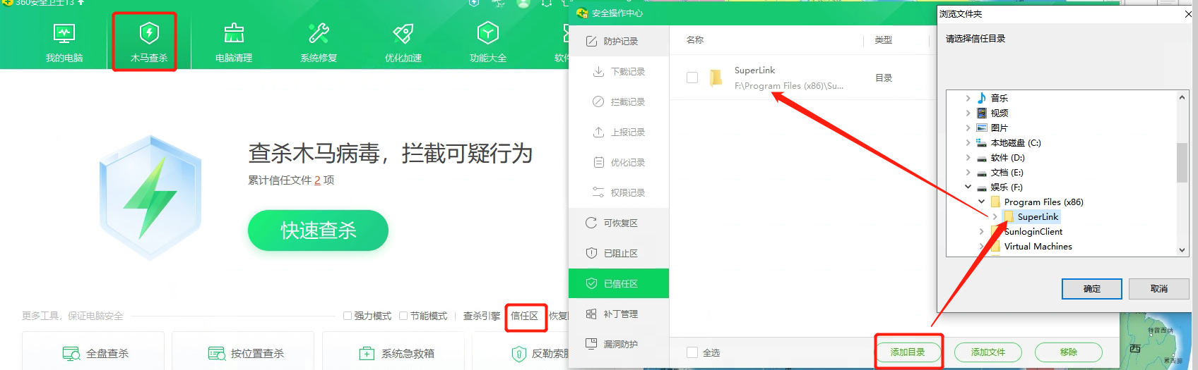 電腦端運行殺毒防護軟件(騰訊電腦管家,360安全衛(wèi)士,火絨等),對Superlink工具安裝使用具有一定攔截或者網(wǎng)絡(luò)連接異常異常問題,導(dǎo)致Superlink工具登錄后時不時出現(xiàn)無法正常在線或者在線網(wǎng)絡(luò)不穩(wěn)定情況,對此需要注意以下事項: 1.Superlink安裝時,首先臨時退出殺毒防護軟件(騰訊電腦管家,360安全衛(wèi)士,火絨等),安裝完成后將Superlink運行目錄或執(zhí)行文件添加到對應(yīng)殺毒軟件的白名單或者信任區(qū),最后再打開運行防護軟件。以360安全衛(wèi)士添加Superink運行目錄到信任區(qū)為例,如圖: 2.電腦上安裝使用Superlink工具時,未作如上設(shè)置,使用過程中出現(xiàn)Superlink在線網(wǎng)絡(luò)狀態(tài)不穩(wěn)定情況時,建議先卸載Superlink,再按上面步驟重新安裝一下即可。