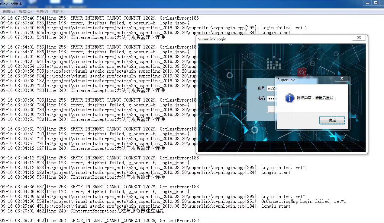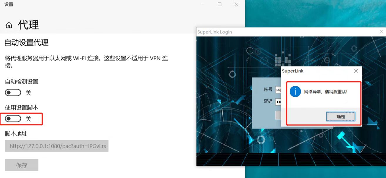 **電腦端登錄Superlink工具時,出現無法使用,并提示“網絡異常,請稍候重試”,通常是一下問題到時,請分別對應確認:** 1.服務器正在維護或者臨時異常,Superlink登錄日志會顯示“無法與服務器建立連接”,此時請反饋技術售后人員,如圖: 2.檢查用戶電腦上設置參數:“更改代理設置”-“代理”-“自動設置代理”-“使用設置腳本”,如果有開啟此選項,一定要關閉。